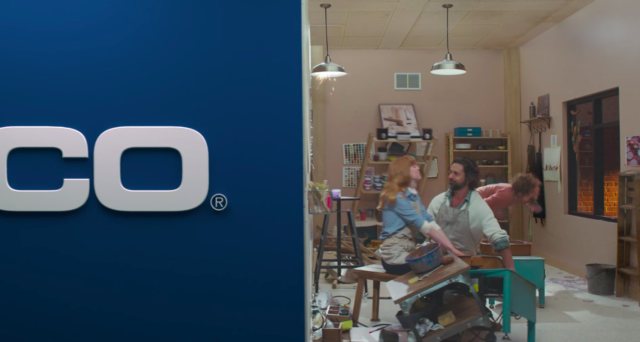 The Martin Agency's latest set of ads are announced by a voiceover which informs you that the ad "has been condensed for your convenience." And it literally has -- in each scenario the entire set is "crushed" by a wall sliding from left to right. Various scenarios, including a pottery class (seen here -- there's also a funny extended ending), a massage, two guys playing racquetball and a crew of grocery store employees stacking shelves, are wrecked, while the characters chat throughout about saving money with Geico.